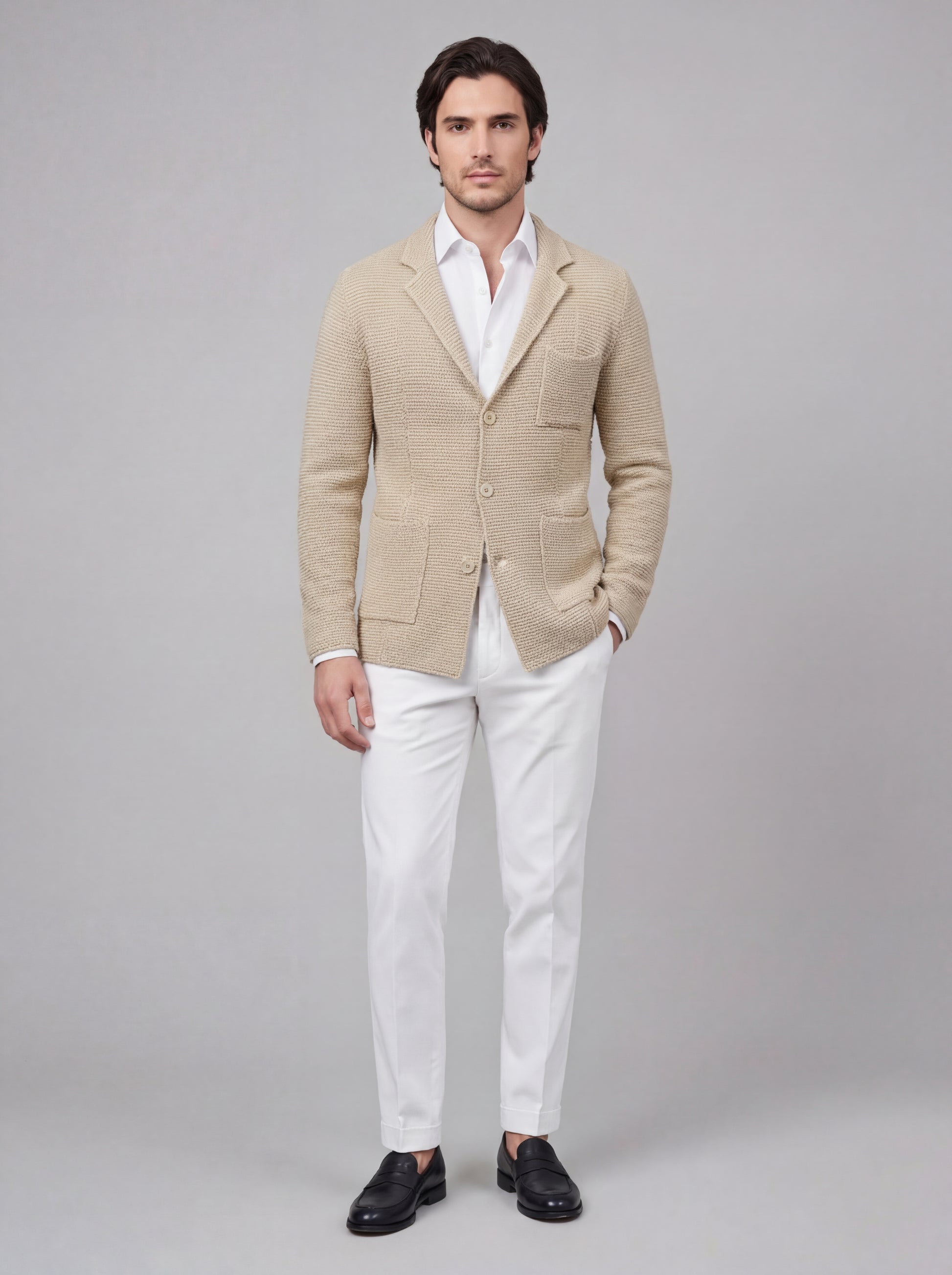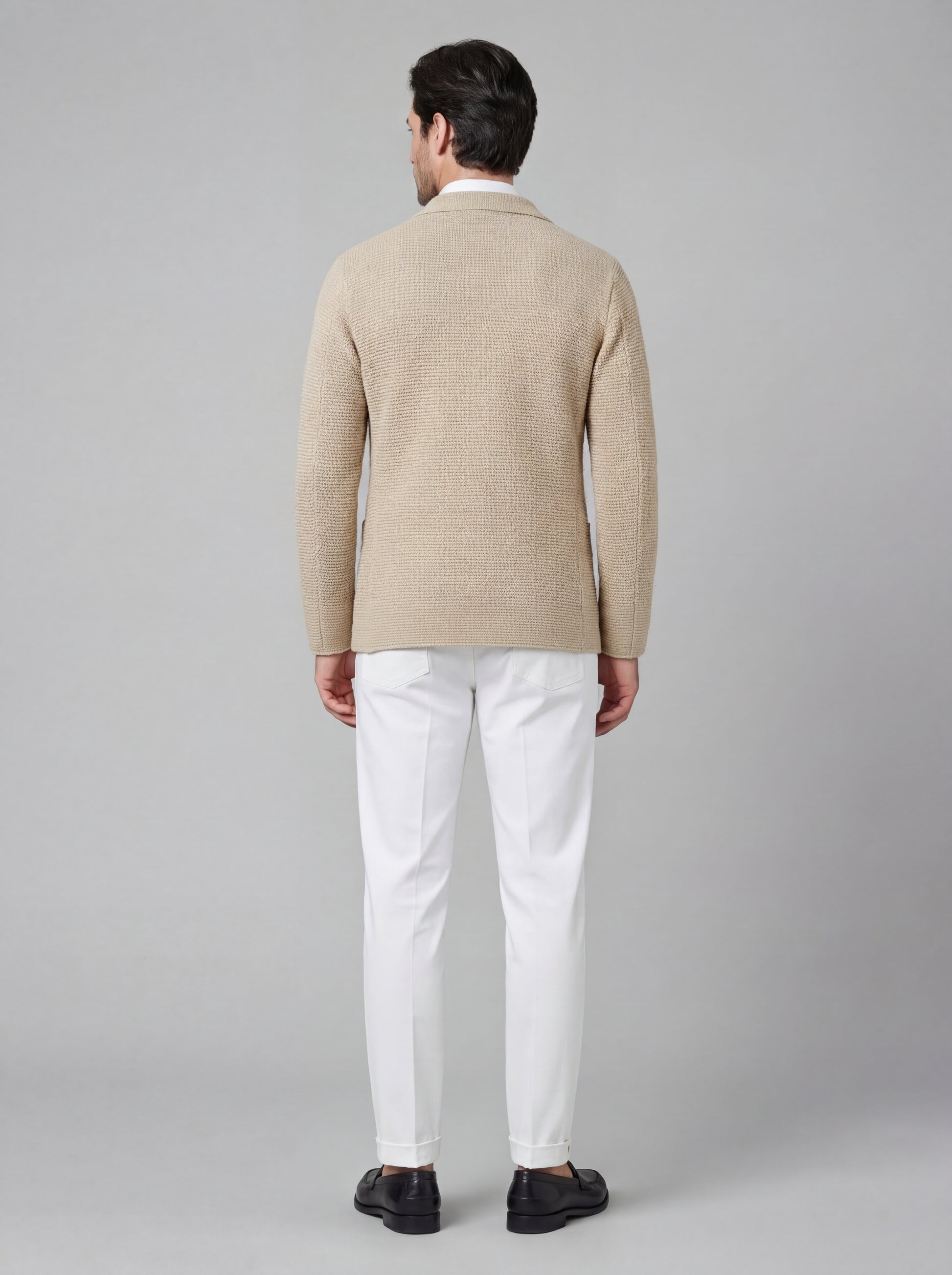 La giacca in maglieria beige di SÈTE FORTE DEI MARMI 1984 nasce dall’incontro tra tradizione sartoriale e spirito contemporaneo. Un capo distintivo del guardaroba maschile, reinterpretato con eleganza e proporzioni moderne.