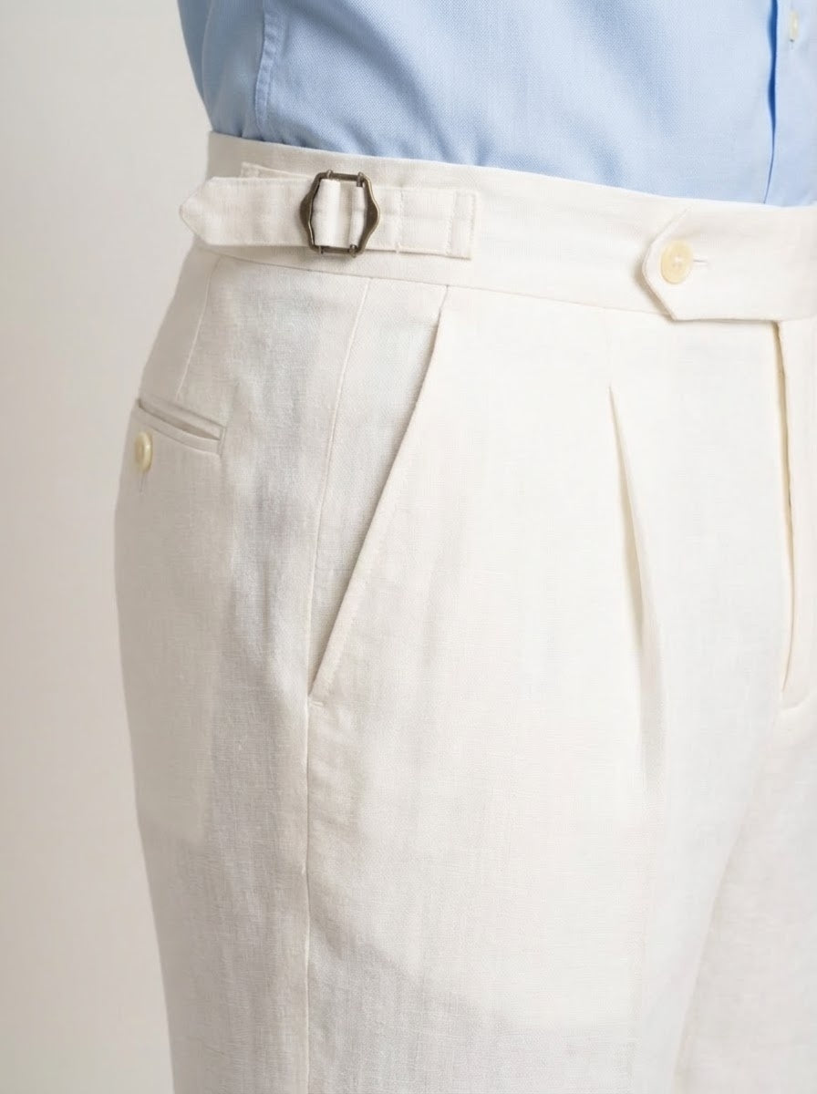 Un elemento distintivo del Pantalone Marcello è proprio la presenza dei regolatori in vita, che offrono una regolazione elegante e pratica senza la necessità della cintura. Il lino, con la sua texture fresca e traspirante, lo rende un capo essenziale nel guardaroba maschile estivo.