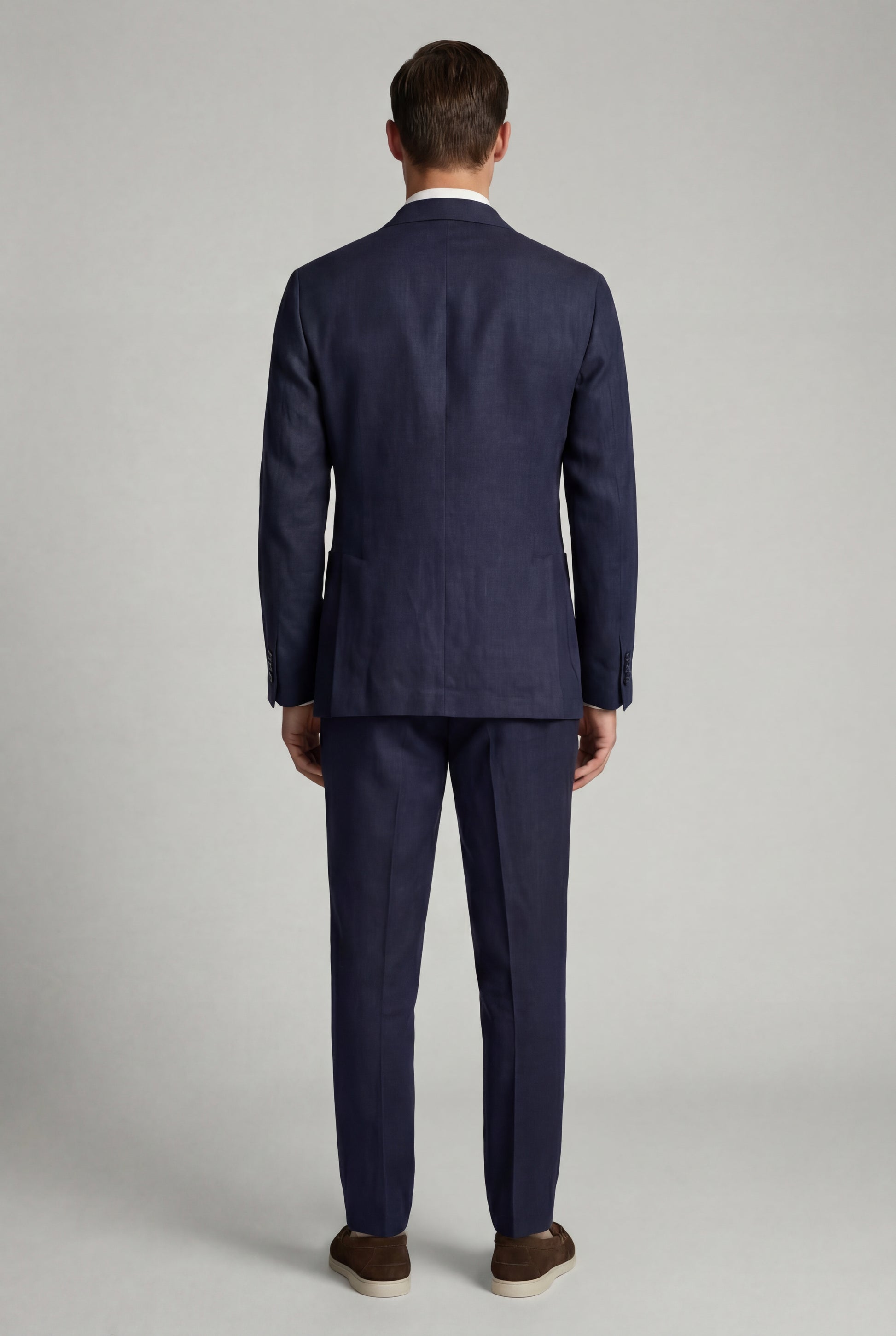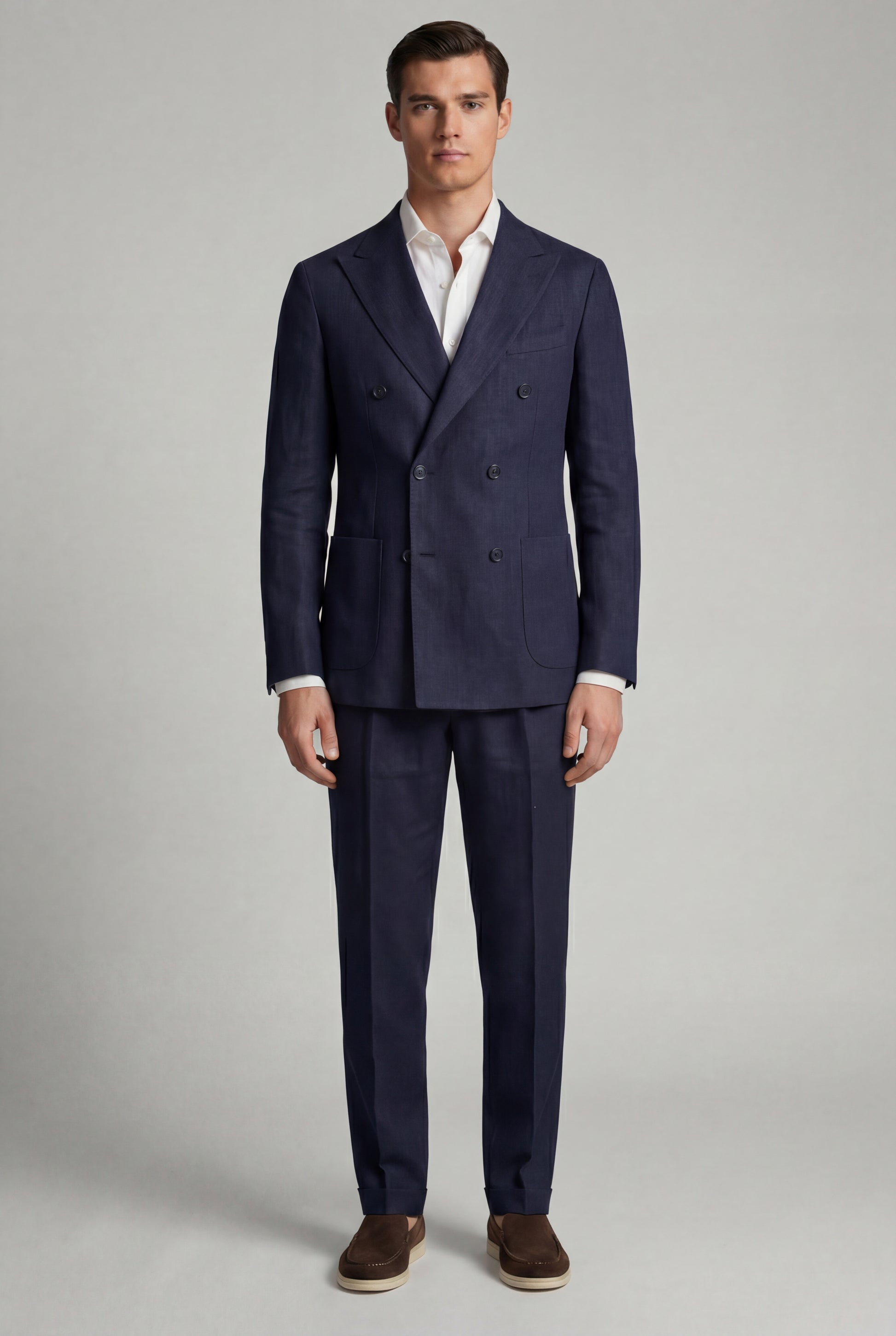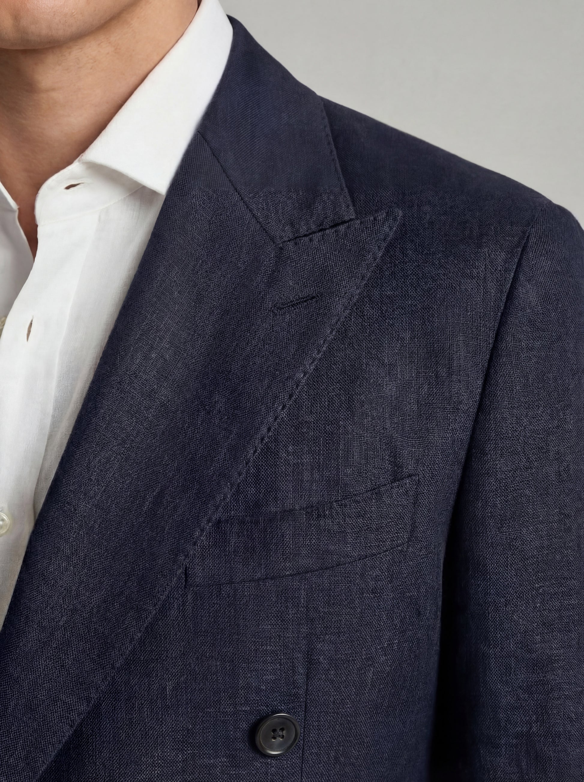 La struttura doppiopetto con rever a lancia conferisce alla giacca una silhouette decisa ma armoniosa, mentre la vestibilità è studiata per valorizzare la figura con comfort e leggerezza. Ogni dettaglio è curato con precisione sartoriale: dalle tasche a filetto ai bottoni in tinta, fino alle cuciture interne rifinite con estrema attenzione.