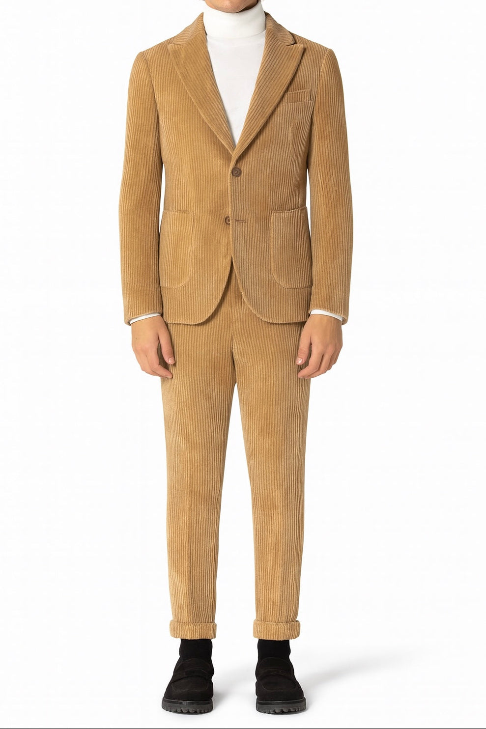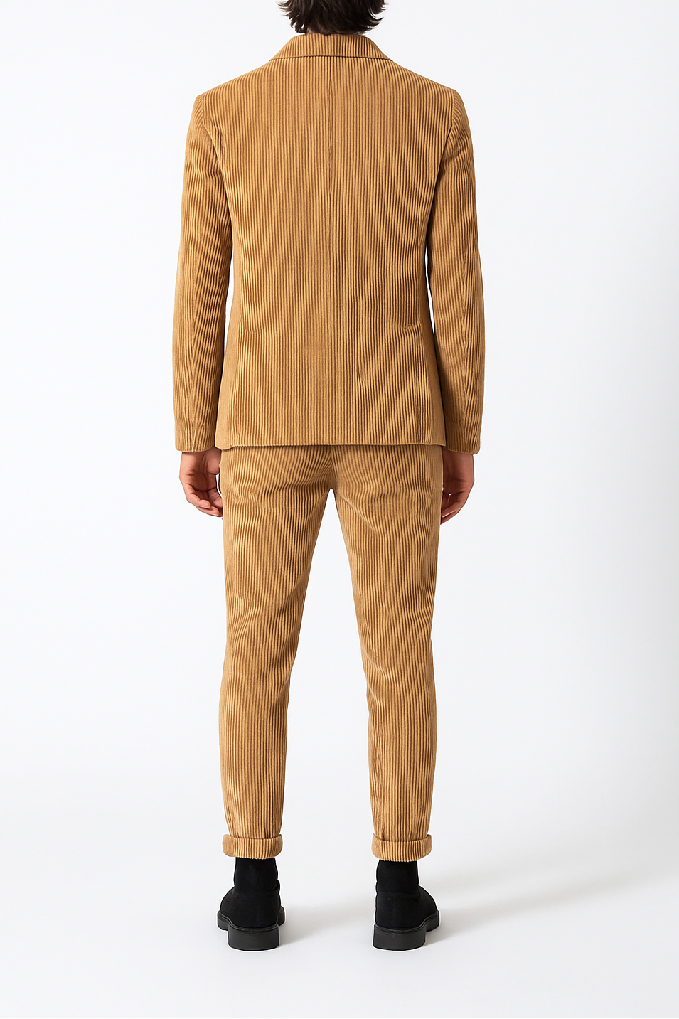 La giacca presenta una chiusura a due bottoni, revers a lancia e tasche applicate, mentre il pantalone, dalla linea asciutta e moderna, garantisce una vestibilità impeccabile e confortevole. L’effetto del velluto, caldo e avvolgente, rende questo completo ideale per le occasioni speciali o per chi desidera distinguersi con uno stile ricercato anche nella quotidianità.