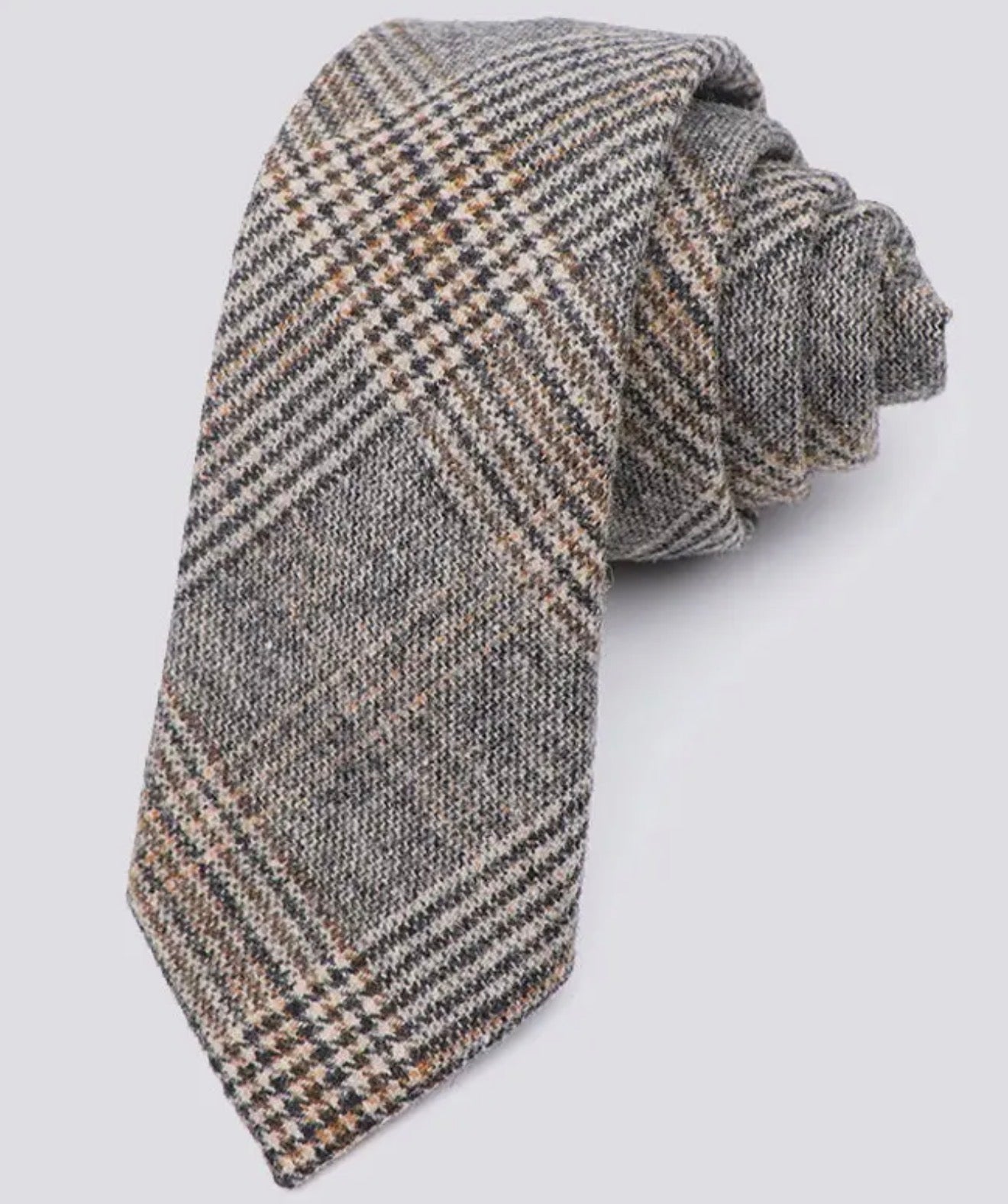 Il motivo check nei toni del grigio, beige e marrone crea un equilibrio armonioso tra classicità e contemporaneità, rendendo questa cravatta un accessorio versatile da abbinare sia a un abito sartoriale che a una giacca in tweed o velluto.