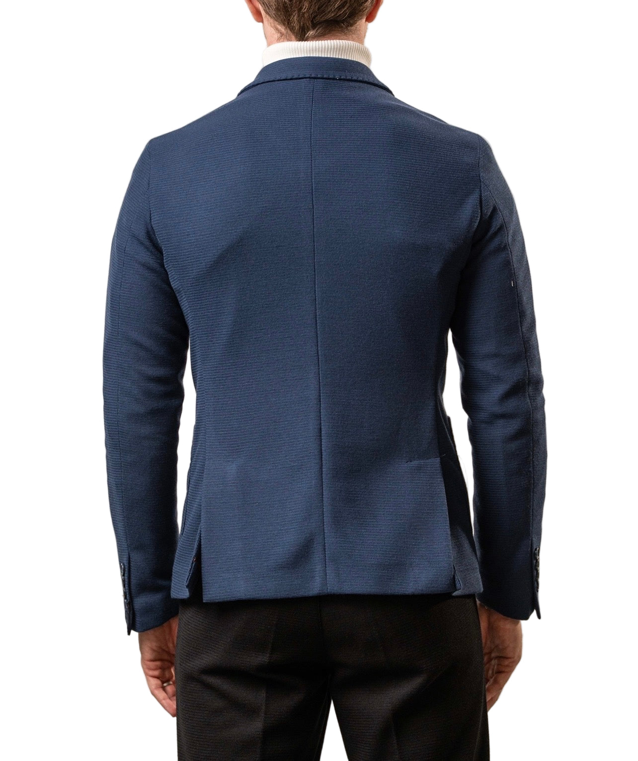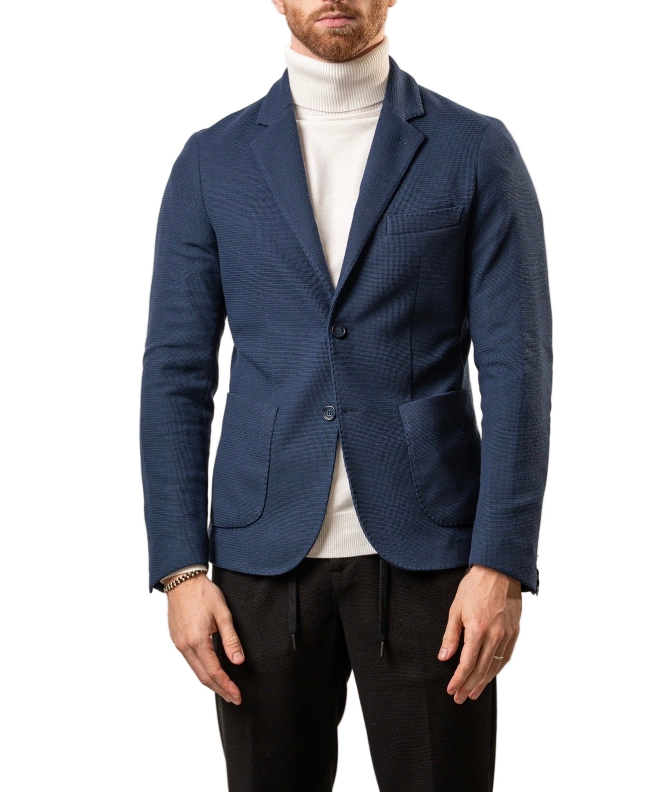 Realizzata in un pregiato tessuto di maglieria, la giacca si presenta in una sofisticata colorazione blu, intensa e intramontabile, capace di adattarsi con disinvoltura a molteplici contesti, dal lavoro al tempo libero. La struttura monopetto a due bottoni, arricchita da tasche applicate e taschino sul petto, conferisce al capo una linea pulita e dinamica, mantenendo sempre un perfetto equilibrio tra formalità e spirito sportivo.