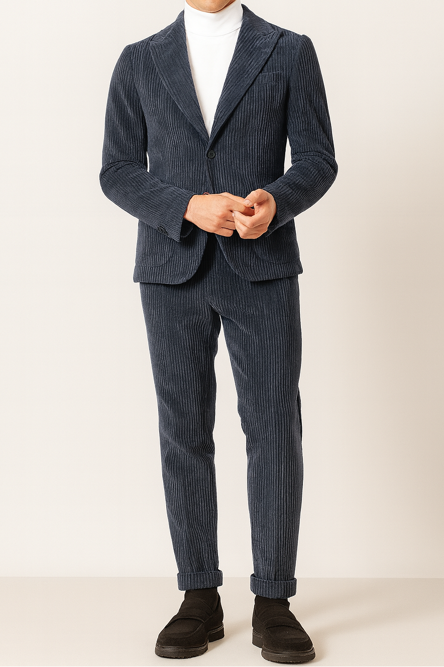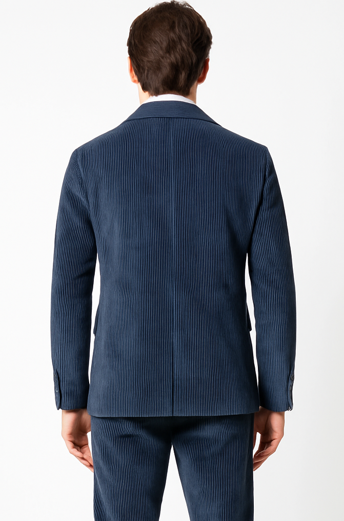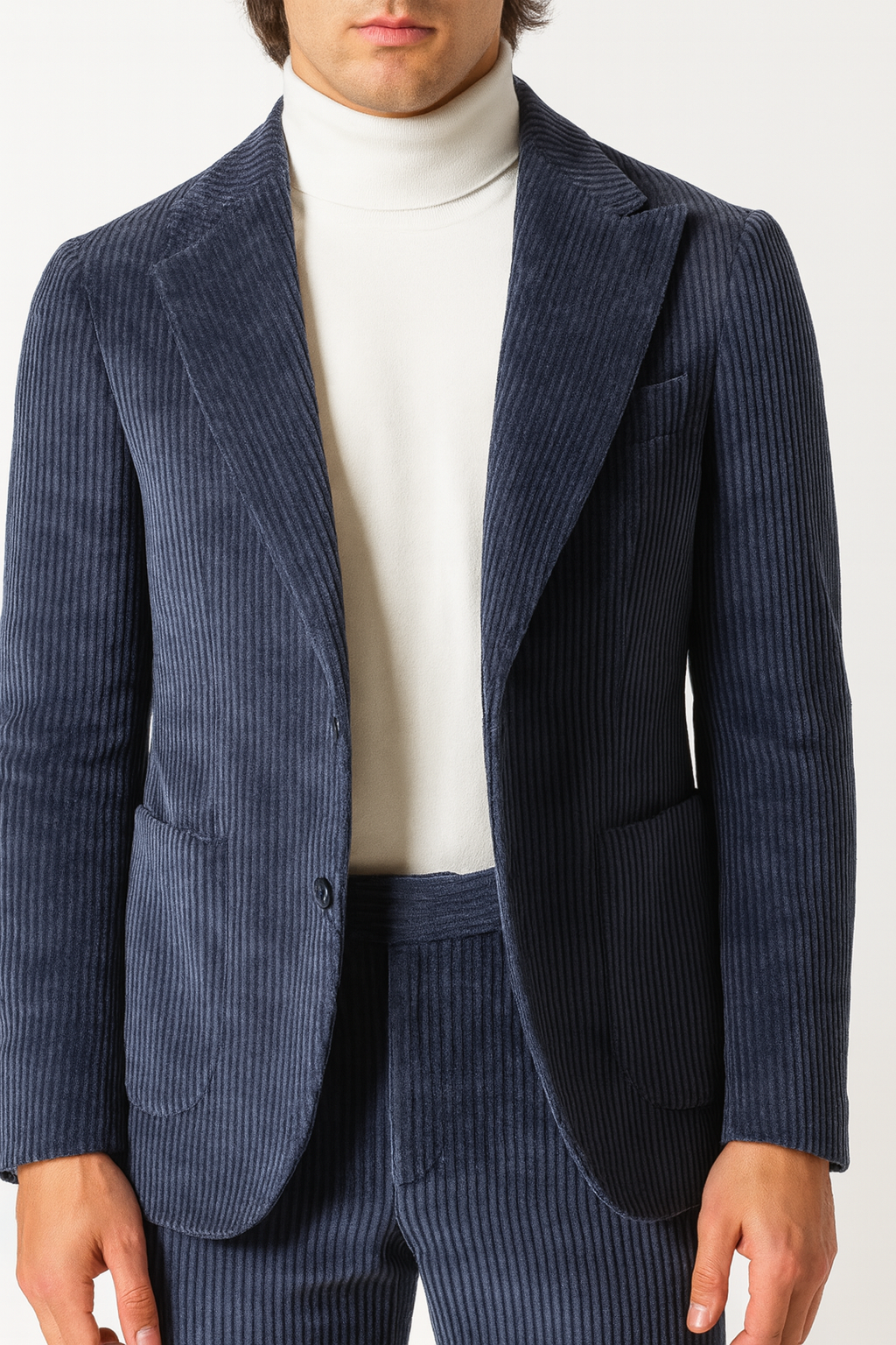 Il taglio impeccabile valorizza la silhouette, mentre il rever a lancia dona un tocco di sofisticata audacia. La chiusura a due bottoni, le tasche con pattina e il taschino sul petto sono dettagli che esaltano la cura artigianale del capo. La texture morbida e ricca del velluto blu lo rende perfetto per serate eleganti o eventi speciali, ma è anche sorprendentemente versatile per look casual-chic.