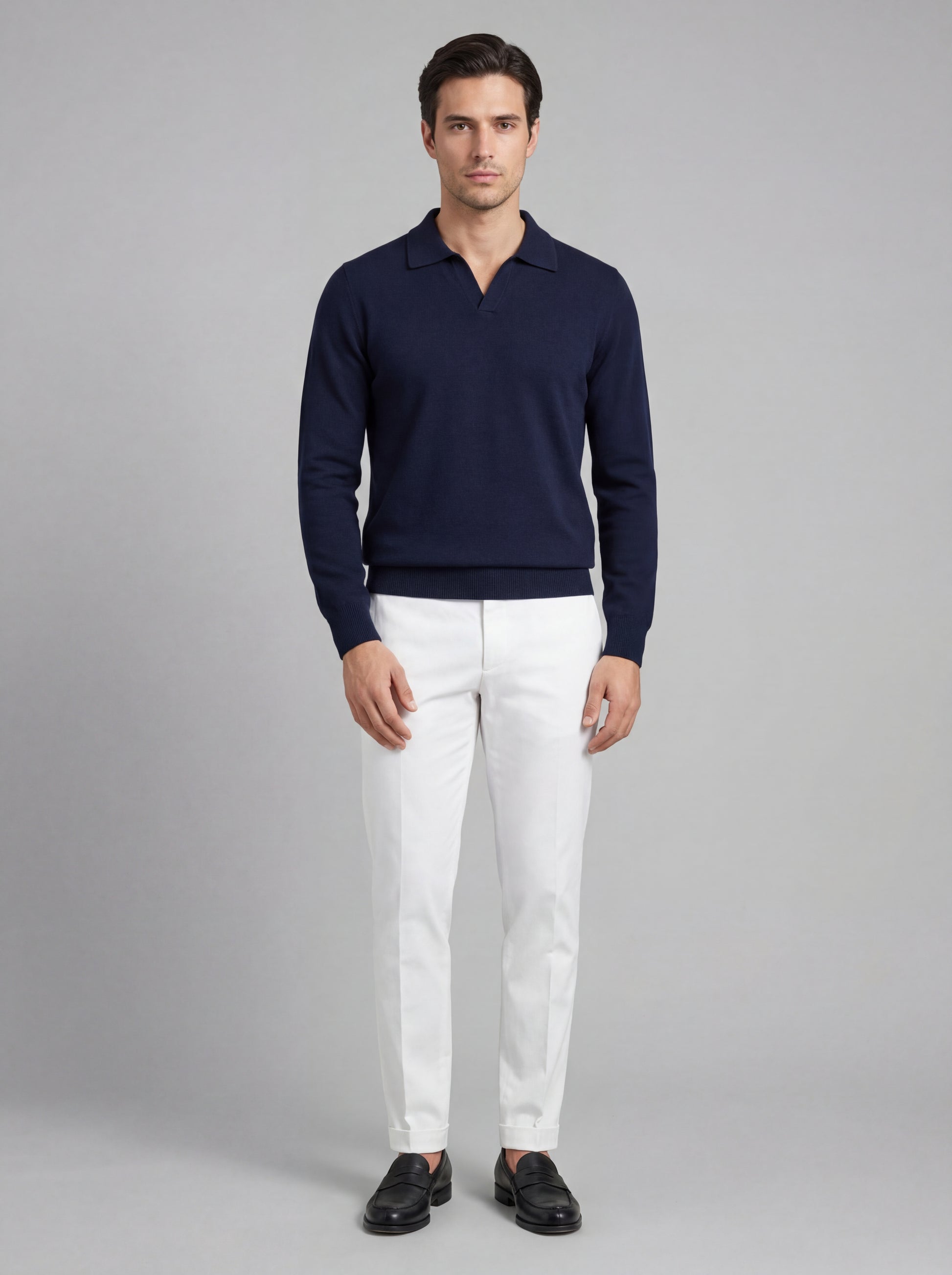 Il suo colletto aperto senza bottoni e la linea essenziale la rendono estremamente versatile: ideale da indossare sotto una giacca per un look formale e sofisticato, oppure abbinata a un pantalone chino o sartoriale per uno stile più rilassato ma sempre impeccabile.
